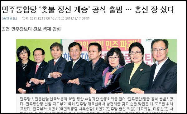 ‘민통당’은 18일 민주당 손학규 대표와 한명숙 고문, 문재인 노무현재단 이사장, 이해찬 전 총리, 이용득 한국노총 위원장 등이 참석한 가운데 신당 출범 기념식을 갖는다고 한다. 조선일보는 ''민주당+친노(親盧)+시민단체+한국노총' 결합을 알리는 신고식이다. 안희정 충남지사, 송영길 인천시장, 최문순 강원지사, 강운태 광주시장, 김완주 전북 지사, 박준영 전남지사 등 민주당 소속 광역단체장들은 모두 자동 입당한다'고 전하면서, 무소속으로 남아 있던 김두관 경남지사, 범좌익세력의 지원으로 당선된 박원순 서울시장도 입당할 가능성이 있다고 지적했다. '내년 1월 15일 치러지는 신당 지도부 경선 과정 등을 지켜보면서 입당하게 될 가능성이 크다'는 박원순 측의 말을 전한 조선닷컴은 '안철수 서울대 교수까지 지원하게 될 경우에는 4월 총선판 전체를 흔들 수도 있다'고 전망했다. 하지만, 이 모든 통합은 좌익패당의 망국촉진극이 될 수 있다.국민의 재산과 자유에 고통을 가할 민주통합당의 당명에 대한 국민의 희화적 별명은 의미심장하다. 동아일보는 '민주당과 시민통합당이 16일 합당을 공식 결의하면서 신당의 이름을 ‘민주통합당’으로 결정했다. 당초엔 오후 2시 ‘통합민주당’과 ‘시민민주당’ 중에서 골라 발표할 예정이었으나, 1시간 동안 회의를 갖고 원점에서 다시 논의했다'며 여러 가지 당명에 대한 의미를 전했다. ''여론조사 결과가 엇비슷하다'는 게 표면적인 이유지만 통합민주당은 예전에 쓰던 '헌 이름'이란 점, 시민민주당은 유사 명칭(민주시민연대)이 이미 중앙선거관리위원회에 등록돼 있다는 점이 걸림돌이 됐다. 시민민주당이 자칫 '시민당'으로 불릴 경우 '유시민(통합진보당 대표) 정당으로 오해 받을 수 있다’는 점도 감안했다고 한다'고 보도했다. 좌익세력은 국민을 속이기 위해서 하도 당을 자주 바꾸다 보니, 이제 적당한 당명도 찾기 힘들게 되었다. 이는 '상품'은 악화되는데 '간판'만 좋게 바꾸는 '개혁팔이'의 당연한 업보다.