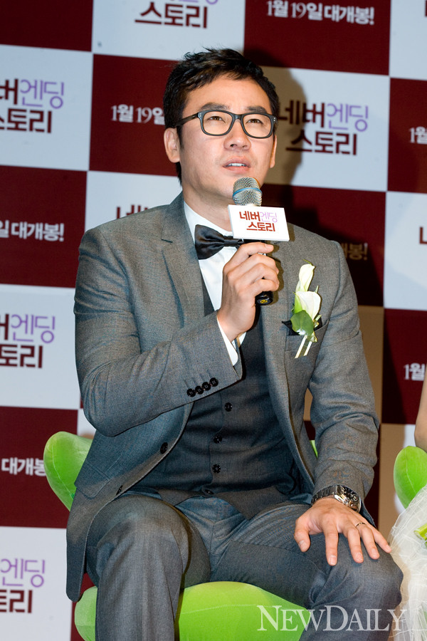19일 오전 11시 영화 ‘네버엔딩 스토리’의 제작 보고회가 열린 가운데 배우 엄태웅이 영화에 대한 이야기를 이어 가고 있다.
