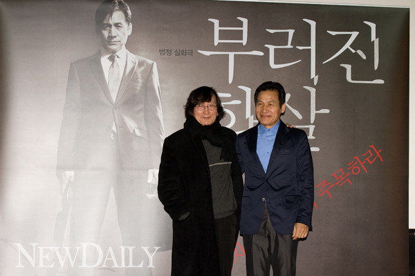19일 오후 서울 동대문 메가박스에서 영화 ‘부러진 화살’의 언론 시사회 및 기자간담회가 열린 가운데 정지영 감독과 배우 안성기가 포토세션을 갖고 있다.