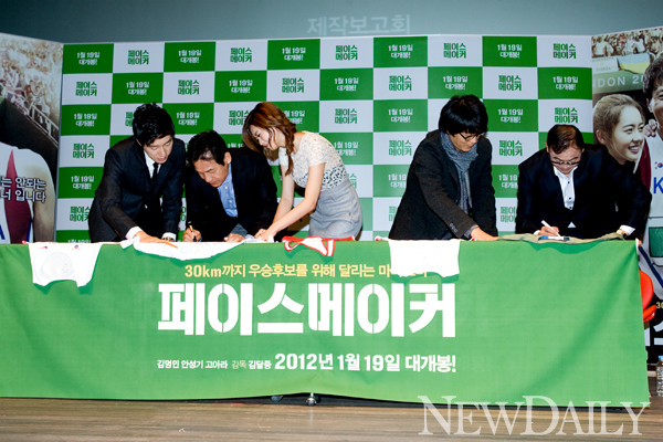 20일 오전 11시 서울 광진구에 위치한 롯데시네마 건대입구점에서 영화 ‘페이스 메이커’의 제작 보고회가 열린 가운데 배우 김명민, 안성기, 고아라, 김달중 감독, 이봉주 전 마라톤 선수가 육상 유니폼에 사인을 하고 있다.