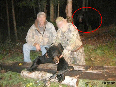 공개된 사진에는 사냥꾼 두 명이 새끼 곰 한 마리를 포획한 뒤 환하게 웃고 있는 모습이 담겨있으며, 아기곰은 이미 세상을 떠난 듯 통나무를 힘없이 끌어안고 눈을 감고 있다.