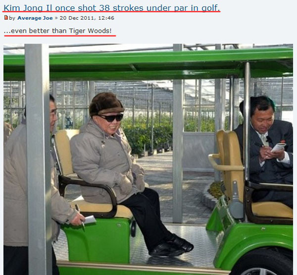 울프럼은 “김정일의 골프실력이 타의 추종을 불허한다는 점은 거식증 환자인 케이트 모스가 핫도그 먹기 대회에서 우승하는 것과 같다”고 말했다.