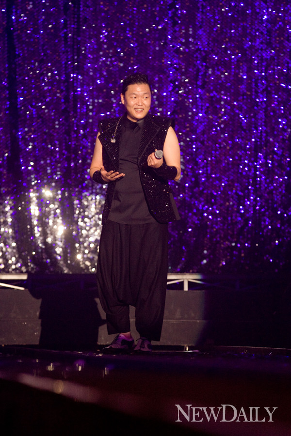 이어 ‘흔들어주세요’를 부르면서 싸이는 대형 팽이 위에서 와이어를 메고 노래를 불러 관중들에게 재미있는 볼거리를 선사했다.