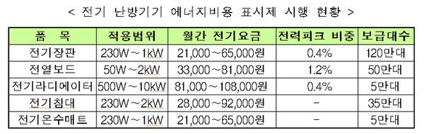 지경부는 “지난 12월 15일부터 전기온풍기, 전기스토브에 대한 에너지비용 표시제를 시행했다. 이번에는 겨울철 전력피크에 미치는 영향이 크고 보급대수가 많은 5개 전기 난방기기를 추가하여 시행하는 것”이라고 설명했다.