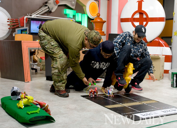지난달 28일 저녁 서울 마포구 상암동에 위치한 손바닥tv 스튜디오에서 ‘하하의 000(땡땡땡)’ 생방송이 진행된 가운데, 부가킹스의 멤버 주비트레인(주현우)과 하하(하동훈), 프리스타일 미노가 말 경주 게임을 벌이고 있다.