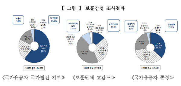 국가유공자들을 보는 시각을 측정하는 보훈감성 지수는 73.4점으로 나타났다. 시민들은 ‘국가유공자들의 국가발전 기여 인정’에서는 84.6점이 나타난 반면 ‘국가유공자 존경 정도’는 71.1점, ‘보훈단체에 대한 호감도’는 60.8점으로 나타났다.