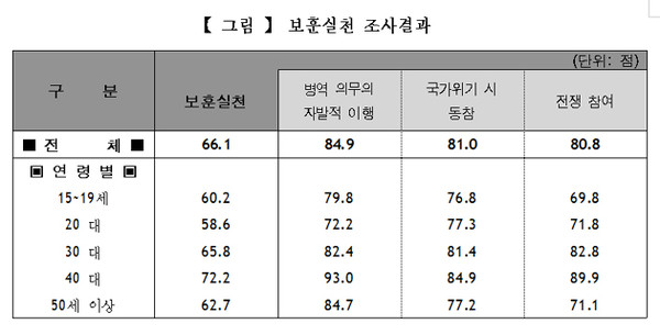 보훈실천 지수는 66.1점으로 2010년 66.6점에 비해 소폭 하락한 것으로 나타났다. ‘병역의무의 자발적 이행’, ‘국가위기 시 동참’, ‘전쟁 시 참여’ 의사를 물어본 결과 80점 이상의 높은 점수를 보였다. 연령대별로는 40대의 참여의사가 가장 높은 반면 20대 이하는 상대적으로 낮은 점수를 보였다.