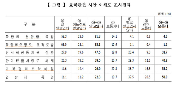 특이한 점은 국가 위기 시 참여하겠다는 답변은 많았던 데 반해 전시작전통제권 전환, 연방제 통일 등에 대해서는 잘 모르고 있는 것으로 나타났다.