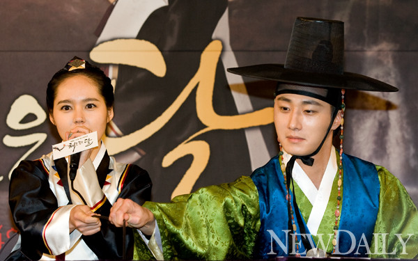 2일 오후 2시 서울 영등포구에 위치한 63빌딩 주니퍼홀에서 MBC 수목미니시리즈 ‘해를 품은 달’의 제작 발표회가 열린 가운데, 한가인이 마이크 선이 짧아 애를 먹자 옆에 있던 정일우가 거들고 있다.