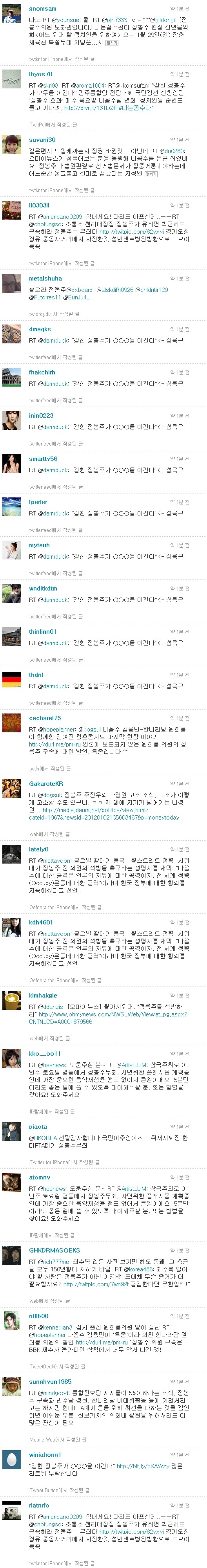 트위터의 글을 보면 조직적인 리트윗(RT)을 독려하는 글과 함께 원희룡 의원이 김여진의 콘서트에서 정봉주 옹호발언한 글이 활발하게 RT되는 모습을 볼 수 있습니다. 얼마전에 원희룡 의원이 김여진의 콘서트에 갔다왔다는 트윗글을 봤는데, 이젠 완전히 커밍아웃한 것 같아 보입니다. <나는 우파다>라고 외치던 그의 모습이 한편으론 가련하게 생각되기도 하네요. 뿌잉~뿌잉~