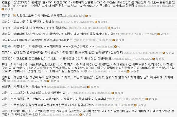 다음은 김기수의 미니홈피에 달린 팬들의 격려 문구 캡처