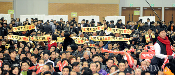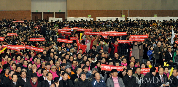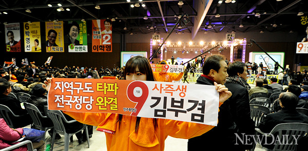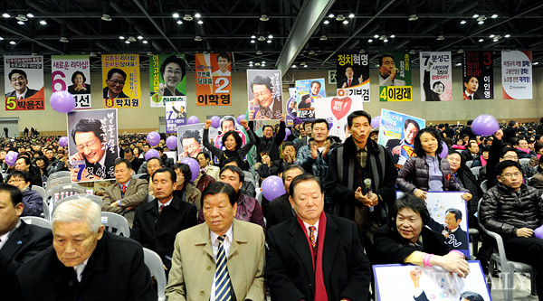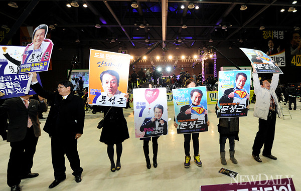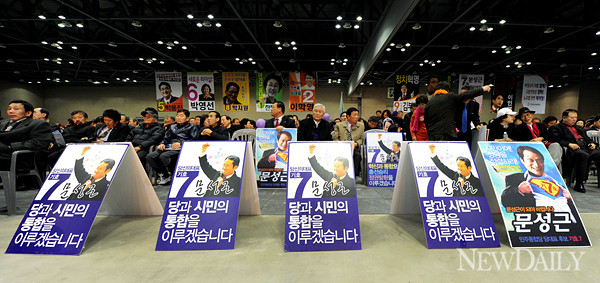 15일 오후 경기도 일산 킨텍스에서 진행된 민주통합당 당대표 및 최고위원 선출대회에서 각 후보 지지자들이 각종 피켓을 들고 유세를 펼치고 있다.