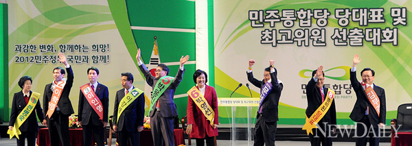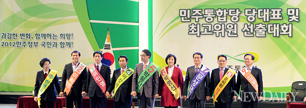 15일 오후 경기도 일산 킨텍스에서 진행된 민주통합당 당대표 및 최고위원 선출대회가 열렸다. 후보자들이 연설에 앞서 대의원들에게 인사를 하고 있다.
