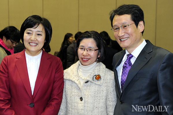 15일 오후 경기도 일산 킨텍스에서 진행된 민주통합당 당대표 및 최고위원 선출대회에서 민주통합당 새 지도부로 선출된 박영선, 문성근 최고위원이 지지자와 함께 기념촬영을 하고 있다.