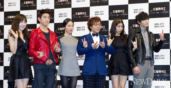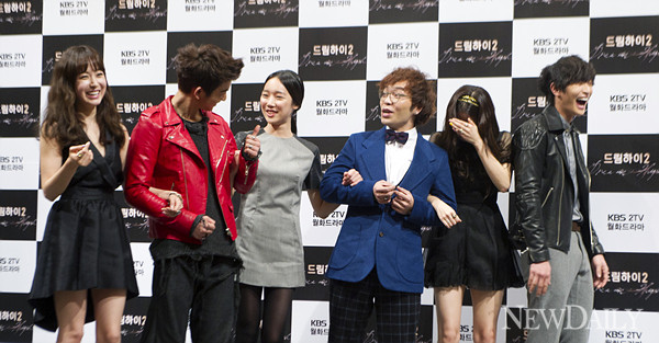 17일 오후 서울 논현동 임페리얼팰리스호텔에서 열린 KBS 2TV월화드라마 '드림하이2' 제작발표회 포토타임에서 유소영, 주니어, 정연주, 김지수, 강소라, 정진운이 포즈를 취하고 있다.