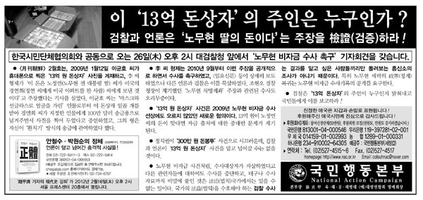 한국시민단체협의회와 공동으로 오는 26일(木) 오후 2시 대검찰청 앞에서 ‘노무현 비자금 수사 촉구’ 기자회견을 갖습니다.