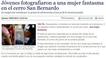 현지 웹사이트는 지난 19일 아르헨티나 북서부 살타주의 산 베르나르도(San Bernardo) 인근 산에 야영을 갔던 청소년들이 휴대폰으로 기념 사진을 촬영하다 정체 불명의 유령 사진을 찍었다고 전했다.