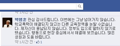 “학교 폭력이 해결되지 않고는 다른 교육 정책을 논할 수 없다”는 의견이다. 박 수석은 30일 자신의 페이스북에 이 같이 밝히고 “정부도 입으로 말하지 않기로 했다. 행동으로 현장 중심에 서서 해결해 보겠다”고 글을 올렸다.