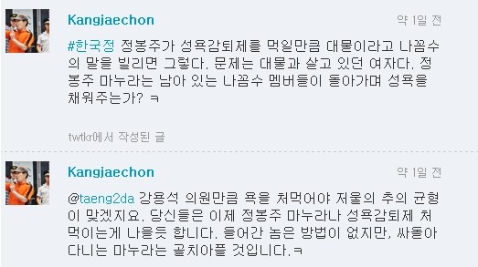 그래서 뽐뿌쟁이가 트위터에서 <정봉주 부인의 성욕은 어떻게 해결할 것이냐>고 물은 것이다. 그 예시가 좀 자극적이었지만, 그런 문제를 만든 것은 나꼼수라는 것이다. 그들이 그 예시에 등장한 것 뿐이다. 근데 이 글이 올라가고 나서 근 이틀동안 뽐뿌쟁이에 대한 온갖 욕설이 튀어나오더라는 것이다. 왜 욕하냐? 내 말, 어디 하나 틀린 곳 있나? 뿌잉~~~