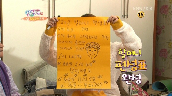 레인보우 고우리는 4일 방송된 KBS 2TV ‘청춘불패2’에서 자신의 글씨체를 공개했다. 대부도 주민 할머니에게 TV 시청 편의를 제공하기 위해 편성표를 크게 직접 써서 드린 게 방송에 나온 것. 그러자 팬들 사이에서는 원래 악필로 공인됐던 고우리 글씨를 놓고 다양한 의견이 나오고 있다.