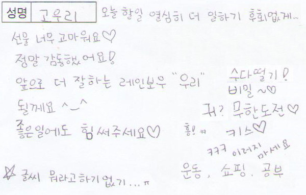 레인보우 고우리가 ‘청춘불패2’를 통해 보여준 글씨체를 놓고 팬들의 의견이 분분하다.