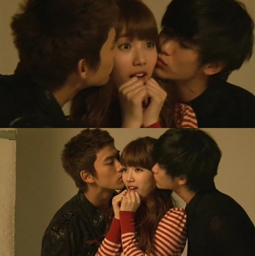 공개된 사진에는 KBS 드라마 '드림하이 시즌1'의 포스터 촬영 현장이 담겨 있으며, 수지를 가운데 두고 옥택연과 김수현이 나란히 서서 수지의 양볼에 뽀뽀를 하고 있다.