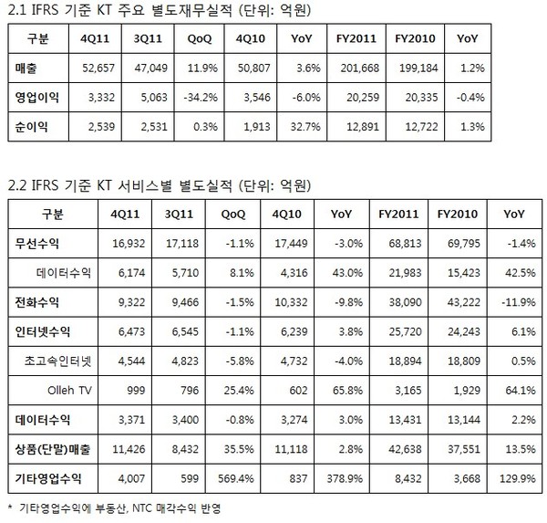 KT는 6일 연결기준 2011년도 매출은 KT스카이라이프, BC카드의 연결편입 영향으로 22조원을 달성하여 2010년 20조3,000억원 대비 8.1% 성장했다고 밝혔다.