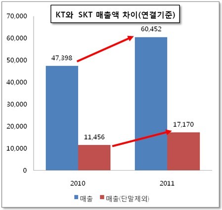 KT의 2011년도 별도기준 매출액에서 단말매출을 제외해도 15조9,030억원으로 SK텔레콤의 별도기준 매출액 12조7,047억원보다 여전히 3조1,983억원이 많다.