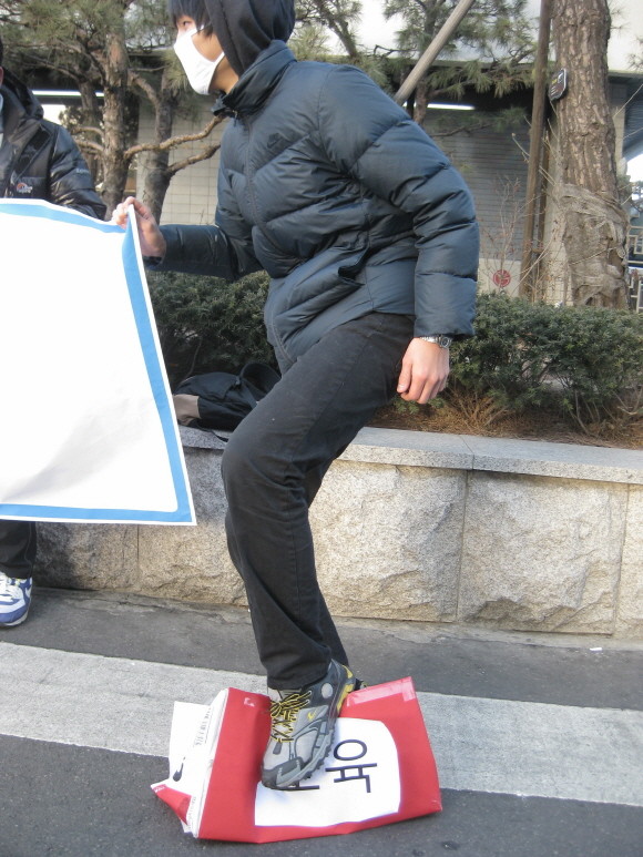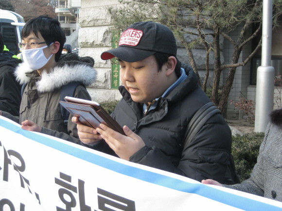 ▲성명서를 낭독 곽도훈 대표그는 “우리는 무조건적인 자유를 바탕으로 한 학생인권조례를 반대한다”고 역설했다. 그 이유로 ▲지나친 자유를 법으로 정해주면 교사들의 敎權(교권)이 무너지고 ▲무분별한 개인적 자유가 불순한 학생들의 武器(무기)가 될 수 있다는 점을 들었다.