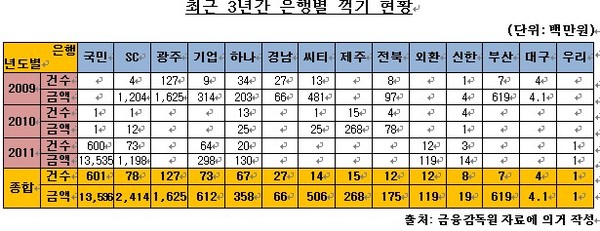 국민은행은 3년간 601건과 135억원의 꺾기를 해 국내은행 가운데 꺾기 횟수나 금액 면에서 최고의 자리에 올랐다.