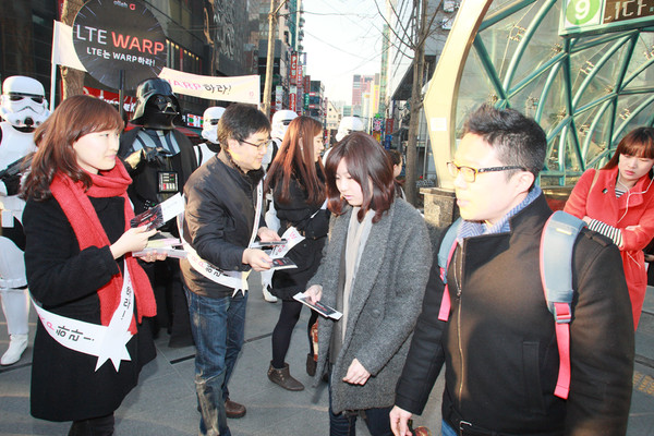 KT는 15일 LTE 워프(WARP) 본격 출정에 따라 오는 17일까지 서울 강남역 등 유동인구가 많은 지역에서 가두 캠페인을 실시한다고 밝혔다.