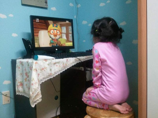 소녀가 하염없이 바라보고 있는 대상은 다름아닌 애니메이션 캐릭터 뽀로로. TV 속에 뽀로로가 등장하자 냉큼 의자 위로 올라가 마치 신을 영접하는 듯한 자세를 취한 것.