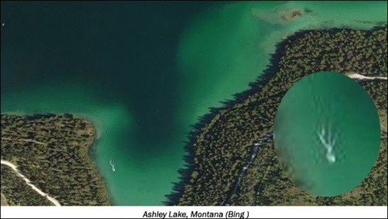 공개된 사진은 미국 몬태나주 애쉴리 호수를 상공에서 촬영한 것으로, 호수에서 둥근 머리와 긴 다리를 가진 괴물체가 유영하는 모습을 담고 있다.
