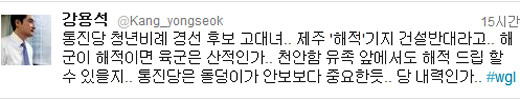 이 같은 좌파진영의 제주해군기지를 보는 시각은 또 다른 좌파 총선후보의 발언에서도 그대로 드러났다. 일명 ‘고대녀’로 알려진 통진당 비례대표 후보 김지윤 씨가 자신의 트위터에 우리나라 해군을 ‘해적’이라고 불렀다 곤욕을 치르고 있다.