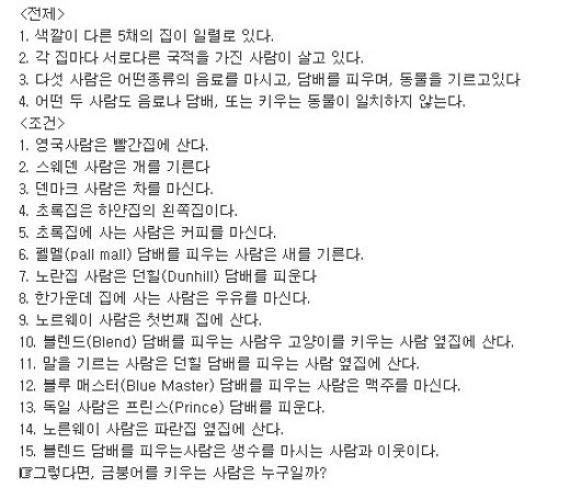 문제는 영국 독일 노르웨이 덴마크 스웨덴 사람 중 전제를 토대로 조건에 맞춰 최종적으로 금붕어를 기르는 사람이 누구인지 맞추는 것이다.