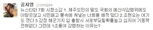 지난 5일부터 트위터를 재개한 공지영은 10일 오후 "(인터넷방송)뉴스타파 7회 시청소감"이라고 밝힌 뒤 "제주도민의 말도, 국회의 예산삭감행위에도 아랑곳 않고 시민을 패고 물속에 처넣는 너희들은 해적이 맞다"는 시청 소감을 남겼다.