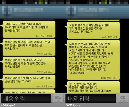 또 10시54분에는 “10시50분 현재 60대 ARS는 끝났습니다. 여론조사는 ARS와 전화면접 두가지 방법으로 진행되는데, 따라서 두 번 전화올 수 있으므로 한번 받았다고 긴장 풀면 안됩니다. 여론조사 전화받으시면 꼭 저한테 문자로 보고해주세요 꼭!!”이라고 자신의 이름과 함께 문자를 보냈다.
