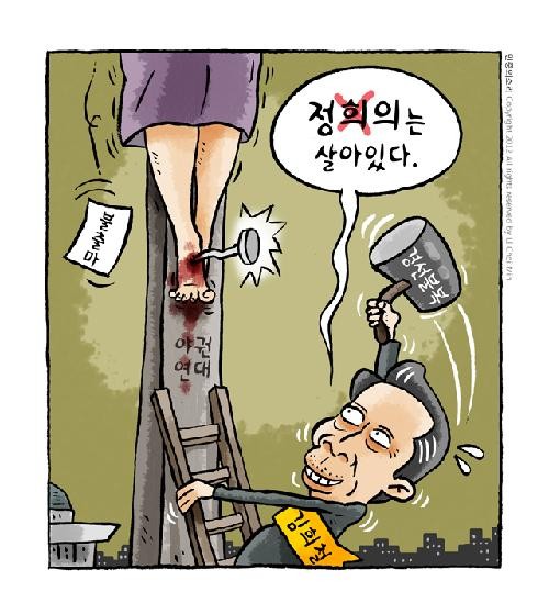 이 대표가 십자가로 보이는 기둥에 매달리고 이 대표와 경선을 치른 김희철 민주통합당 의원이 사다리를 타고 올라와 이 대표의 다리에 못을 박는 모습을 그렸다. 이 대표는 희생하는 예수처럼 붉은 피를 흘리고 있다. 김 의원의 망치에는 '경선 불복'이 적혀 있고, 십자가에 매달린 이 대표는 '불출마'라고 적힌 종이를 떨어뜨린다.