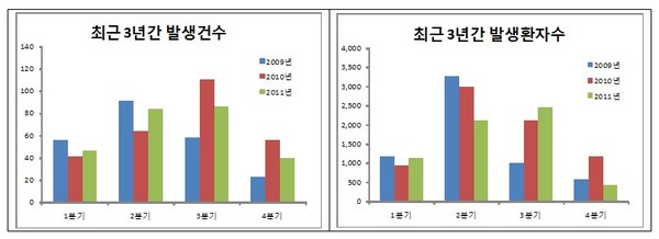 아침과 저녁의 기온이 높지 않아 음식물 취급에 대한 경각심이 떨어져 식중독이 더 많이 발생된 것으로 분석된다.