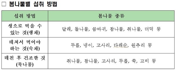 식품의약품안전청은 29일 봄나물을 안전하고 맛있게 섭취할 수 있도록 ‘봄나물의 올바른 조리방법 및 섭취 시 주의사항’ 등 정보를 제공한다고 밝혔다.