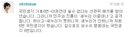 근데, 29일 두통연대의 한축인 민통당에서 <국민생각, 새누리당 2중대 같은 행태 멈춰라>고 했다. 앞장서서 고소하면 선봉대가 아닌가? 선봉대가 어찌 2중대가 될 수 있는가? 참 대단한 어거지를 쓰고 있는 것이다. 자신들의 불법을 어거지로 언론에 생떼를 쓰는 모습을 보면서 야권연대가 아니라 두통연대로 불러야 마땅할 것 같다.