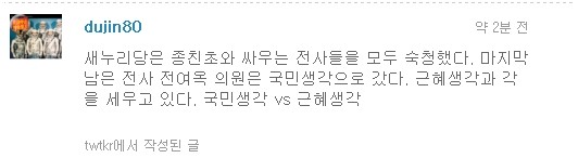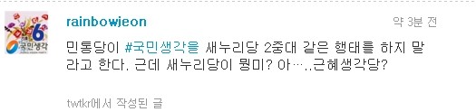 근데 더 재밌는 것은 새누리당에 대한 발전적 당명을 어느분이 작명해 준 것이다. 새누리당은 뭥미? 아.....근혜생각당. 뿌~잉~~~~