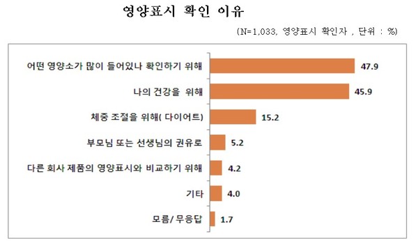 확인하는 이유로는 ▲어떤 영양소가 많이 들어있는지 궁금해서(48%) ▲건강을 위해(46%) ▲다이어트 하기 위해(15%) 등의 순으로 조사됐다.