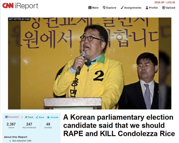 지난 5일 CNN 독자 참여 사이트인 ‘iReport(ireport.cnn.com)’에 ‘A Korean parliamentary election candidate said that we should RAPE and KILL Condolezza Rice(한국 국회의원 후보가 콘돌리자 라이스를 강간하고 죽이겠다고 말했다)’라는 제목의 글이 사진과 함께 올라왔다.