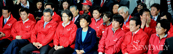 • 새누리당 박근혜 선거대책위원장과 이양희,이준석 비상대책위원을 비롯한 당지도부가 11일 서울 여의도 당사에서 19대 총선 방송사 출구조사 결과를 지켜보고 있다. KBS-MBC-SBS 등 방송3사는 11일 4·11 총선 투표자를 대상으로 출구조사를 한 결과 이번 총선에서 새누리당은 126~151석, 민주당은 128~150석을 각각 획득할 것으로 조사됐다고 보도했다.