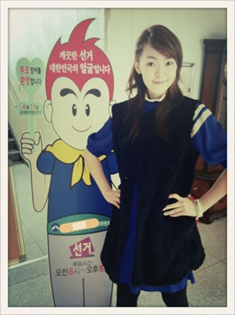 정시아는 11일 자신의 트위터에 "방금 오늘 내일하는 만삭의 몸을 이끌고 반포4동 제2투표소에서 투표했습니다"라는 글과 함께 투표 인증샷을 게재했다.