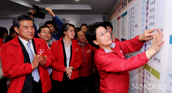 19대 총선 결과 새누리당이 국회 전체의석의 과반인 150석에 근접하고 있는 가운데 11일 서울 영등포구 새누리당 당사에서 새누리당 이혜훈 종합상황실장이 밝은 표정으로 당선자 스티커를 붙이고 있다.