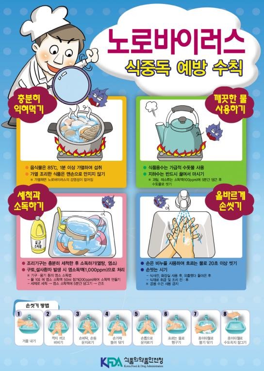 식품의약품안전청은 19일 국내 식중독 발생 주요 원인인 노로바이러스가 식품에서 10일 정도 생존할 수 있는 것으로 확인됐다며 꼼꼼한 세척 습관이 중요하다고 밝혔다.