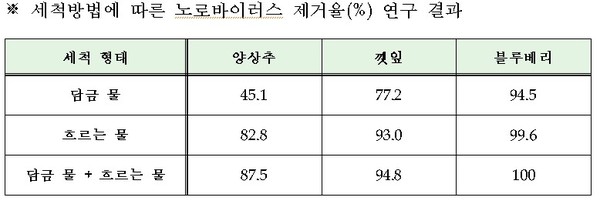 참고로 식품에 오염된 노러바이러스를 제거하려면 물에 2분 이상 담가두었다가 흐르는 물로 충분히 세척하는 것이 효과적이다. -