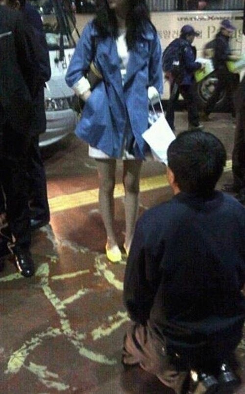 지난 16일 오후 한 네티즌이 미니홈피에 올린 뒤 온라인상에 급속도로 퍼진 이 사진은 주머니에 손을 넣고 서 있는 20대 여성 앞에 한 남성이 무릎을 꿇고 앉아 있는 모습을 촬영한 것. 이 사진은 '버스무릎녀, 아버지뻘 기사에게 무릎 꿇려'라는 제목으로 각종 인터넷 카페와 게시판에 유포된 상태다.